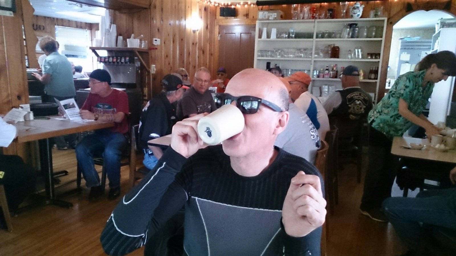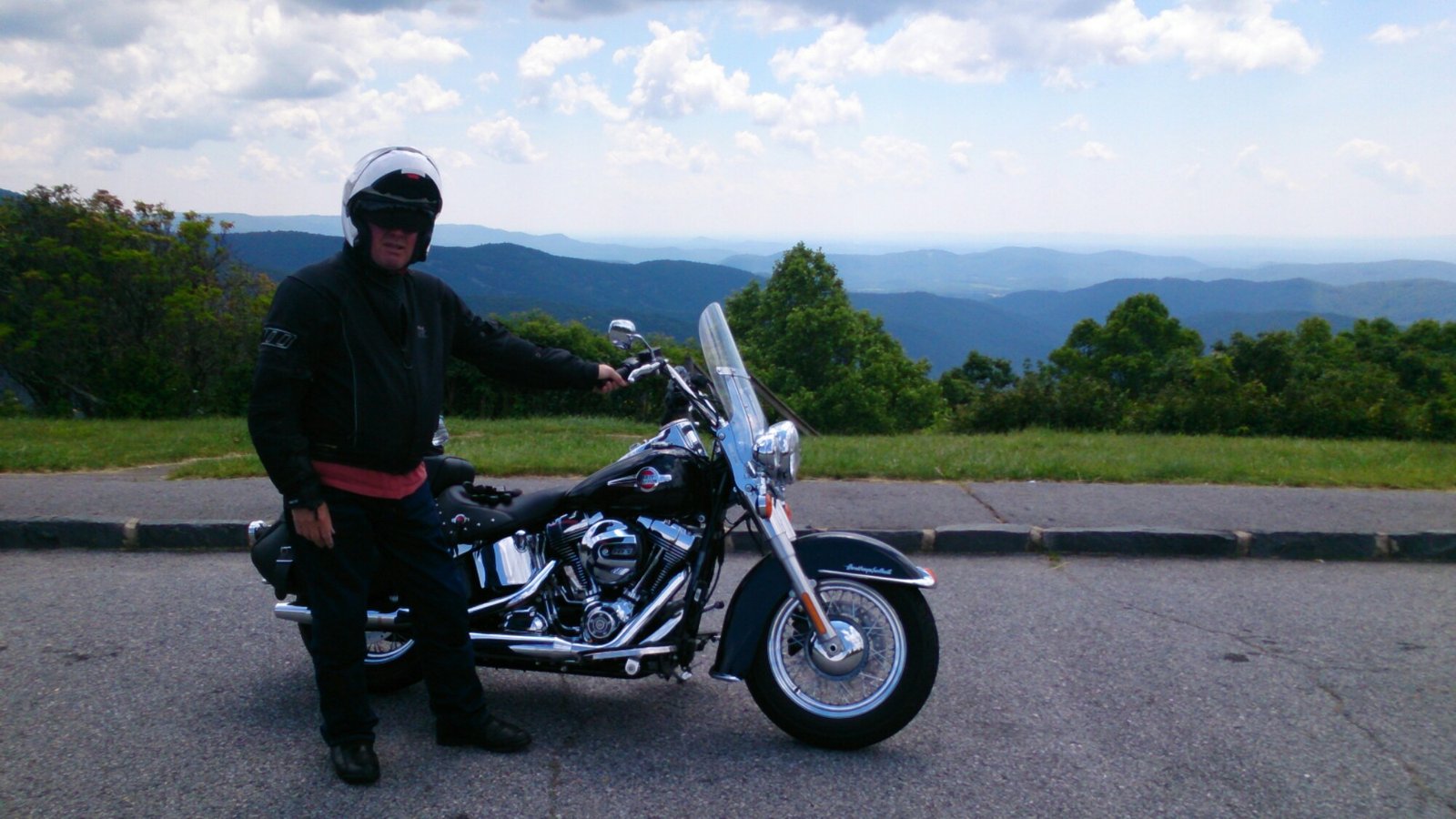 Today we rode the remainder of the Parkway bar just a few miles. There was no breakfast included with yesterday’s hotel so we were on the road early. Lovely road, no traffic and cool air. By 10 we found a proper roadside diner/cafe and had breakfast and topped up with ‘gas’ (just over two dollars a gallon!). The diner was full of motorcyclists out for a Sunday run – see picture. We then rode on with periodic stops to look at the scenery, take on water, for nearly a couple of hundred miles till I had only 40 miles of petrol left. The Blue Ridge Highway hasn’t any petrol stations, shops etc on it – but my sat nav was showing numerous gas stations within a few miles of it. However when I loaded them as destinations I realised that it was showing where they were as the crow flies – to get to them was nearer fifty miles. Our spirited riding then turned into economy mode. Fortunately, as I was just starting to think we would soon be finding out how helpful Americans really are to stranded bikers, we saw a turn off to Asheville. And Asheville was littered with petrol stations and a very pleasant and competitively priced Days Inn. Plus there was a nice Italian restaurant in walking distance. Happy times.